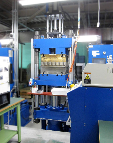 私たち直圧チームでは、社内製造のフェノール材料タイカグライト(炭素繊維複合材料)を使い、ツールホルダ(MC工作機用ATCマガジン部品の一つ)の成型、SMCを使った電力関連製品の成型をしております。